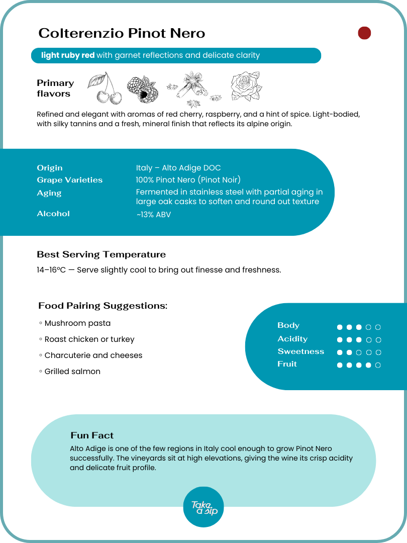 Colterenzio Pinot Nero (Alto Adige) – A fresh and silky red with notes of red berries and soft spice. Elegant and light on its feet.